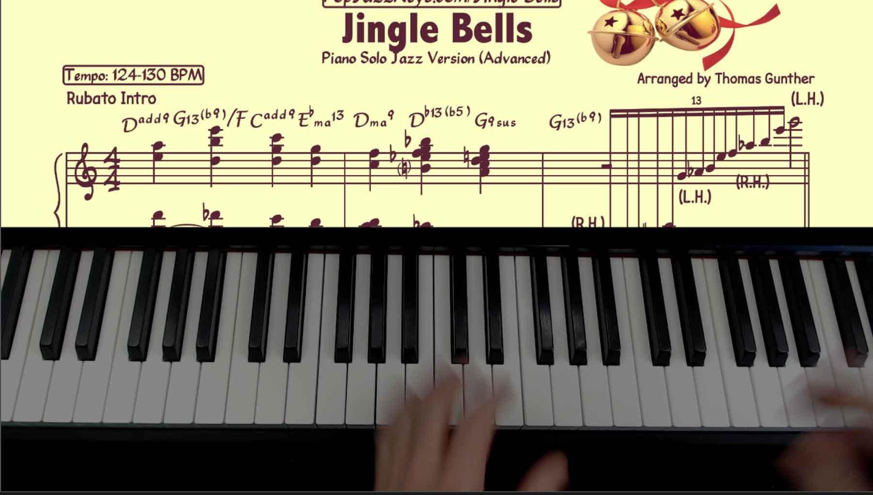 Get the beautifully written sheet music of the advanced Jingle Bells Solo Piano Arrangement by Thomas Gunther at